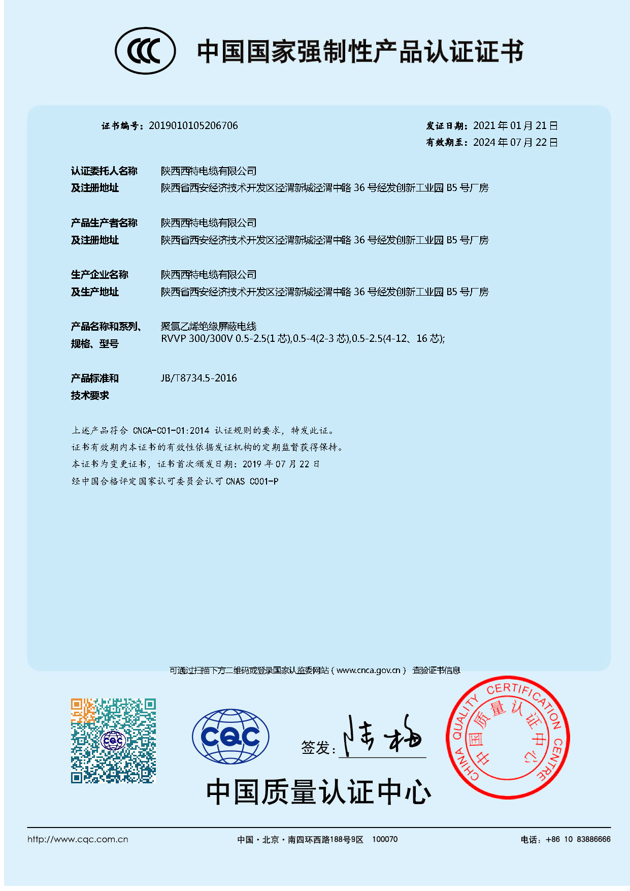 聚氯乙烯絕緣屏蔽電線(RVVP)3C證書