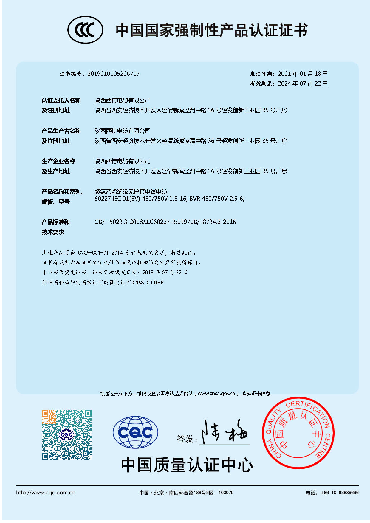 聚氯乙烯絕緣無護套電線電纜(BV)3C證書
