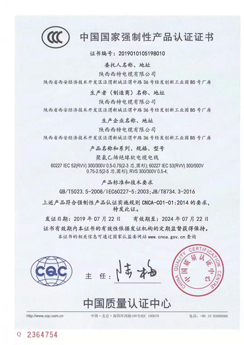 陜西西特電纜有限公司于2019年7月通過中國質量認證中心CQC認證,取得了CCC強制認證證書!